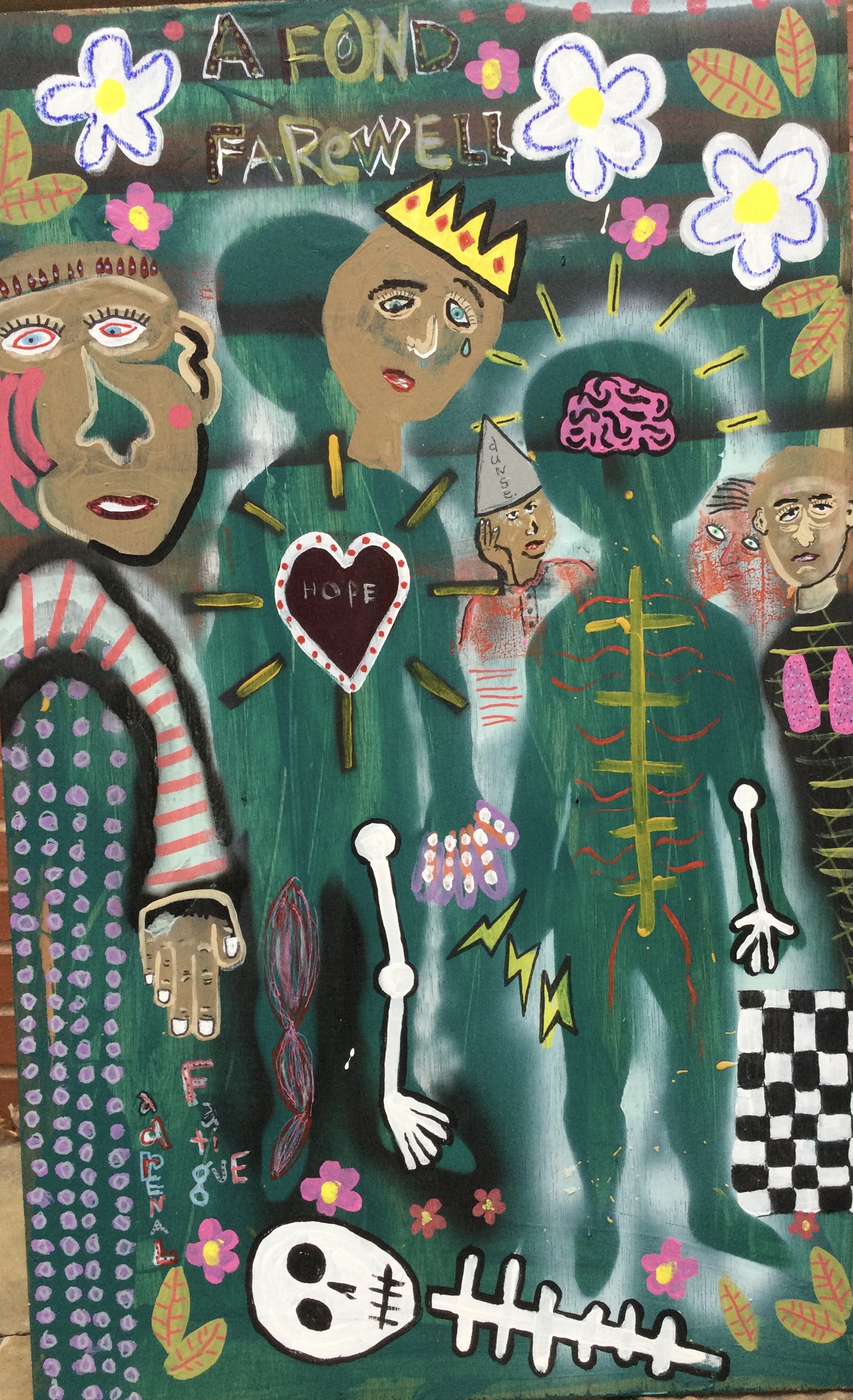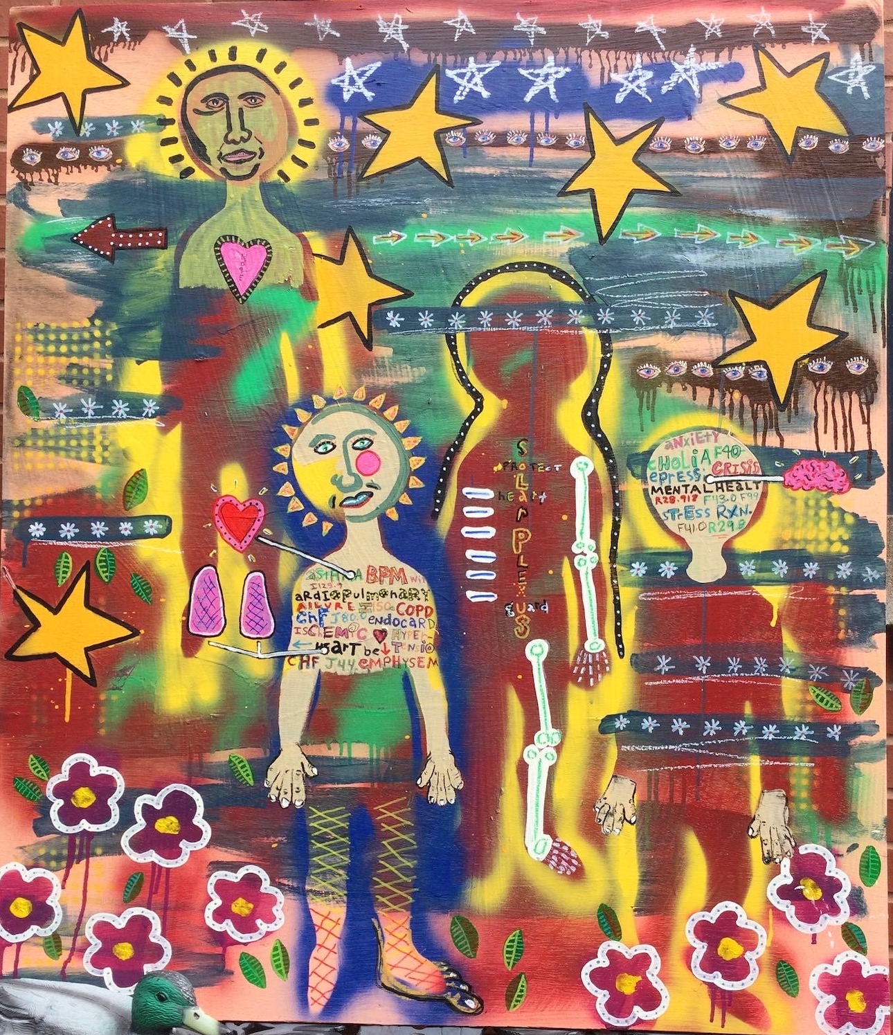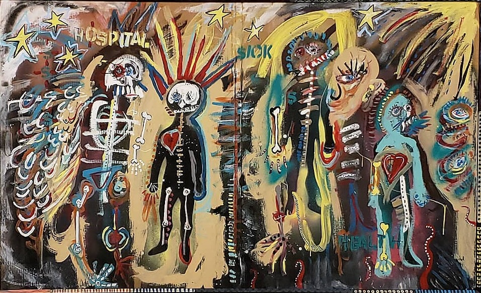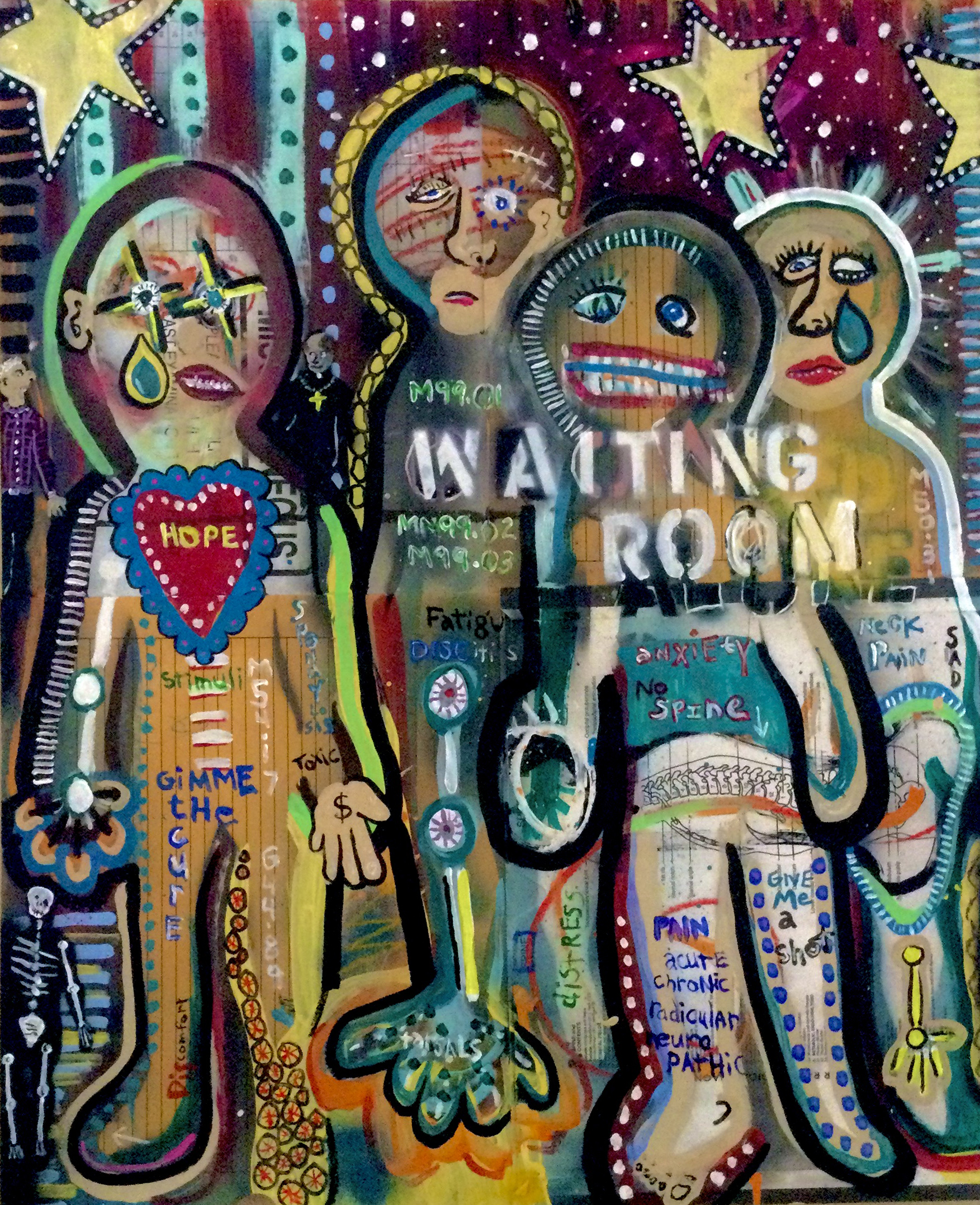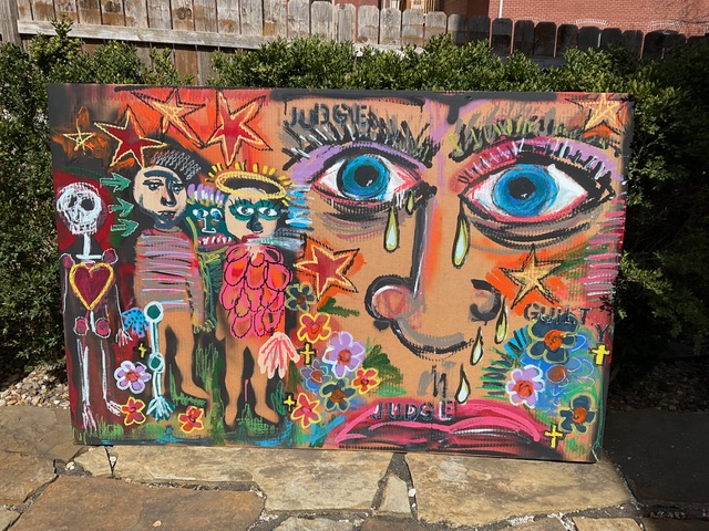 Andy draws his inspiration for his paintings from his diverse career path including pop punk drummer, chimney sweep, forensic autopsy technician and now a practicing chiropractor. His paintings, rendered in the true outsider art/folk art method of using materials at hand, including cardboard, found wood panels and x-ray files, express his visual contemplation of our external influences; social, political and environmental impacts on our mental, spiritual and physical health. All prices below do not include shipping.