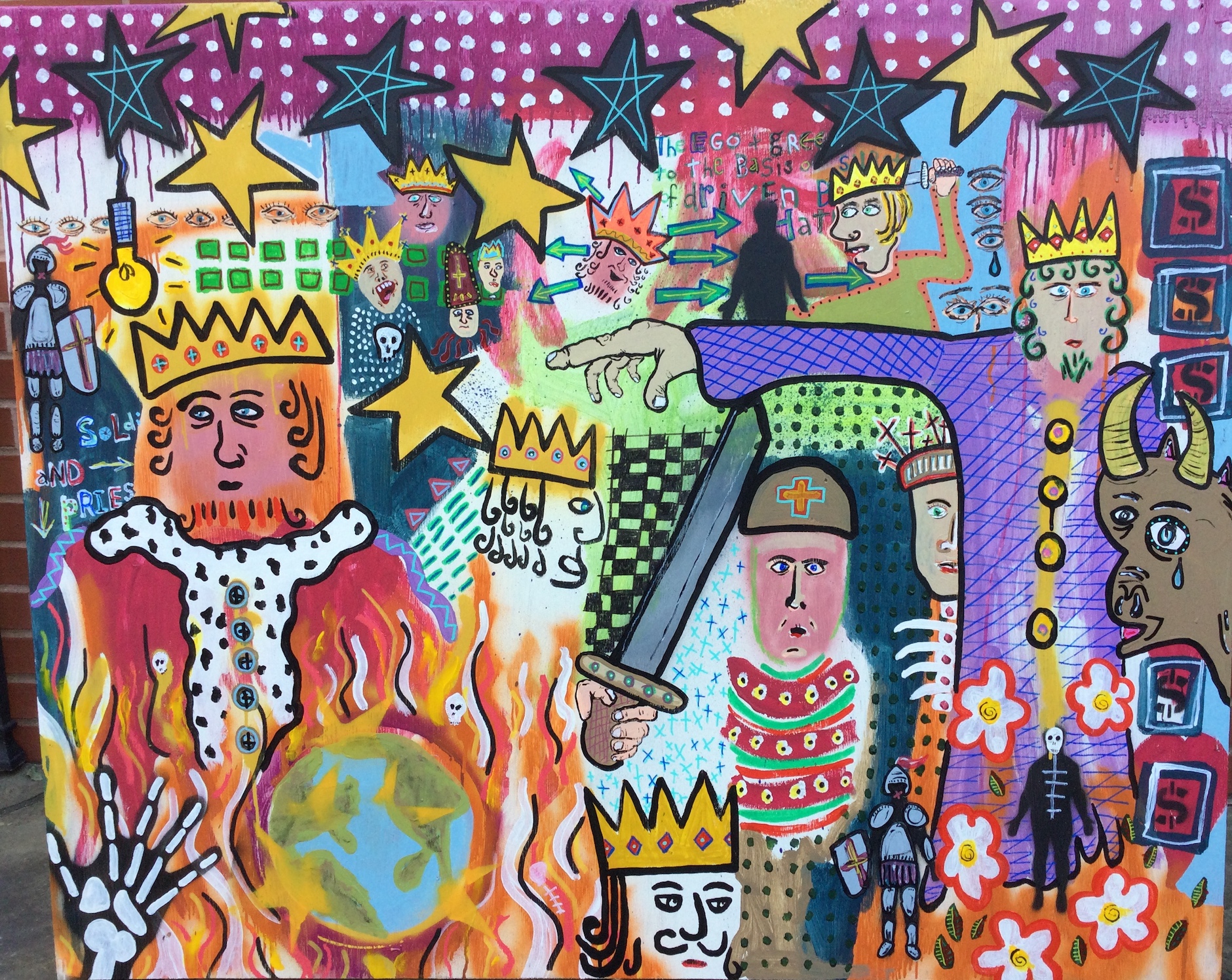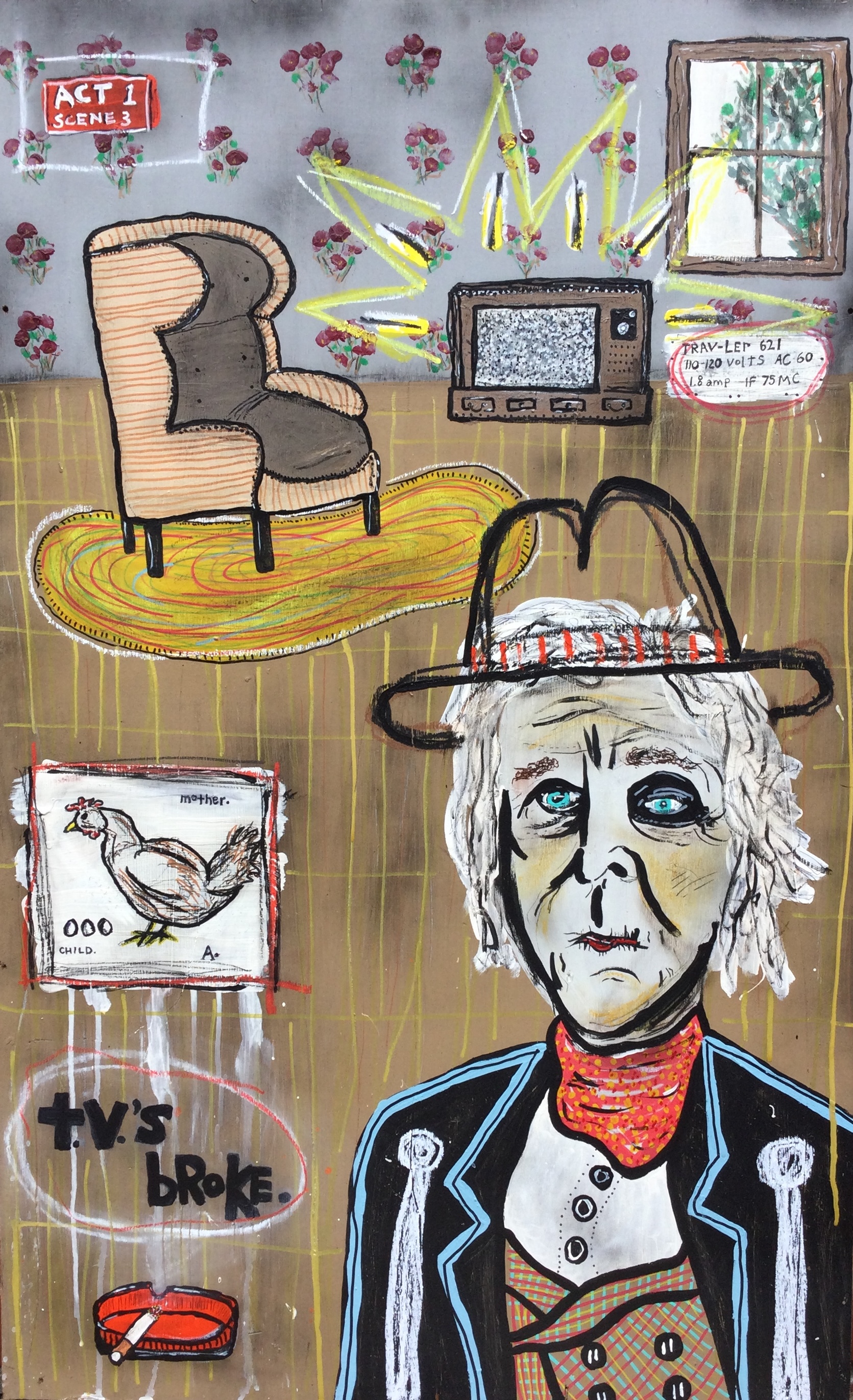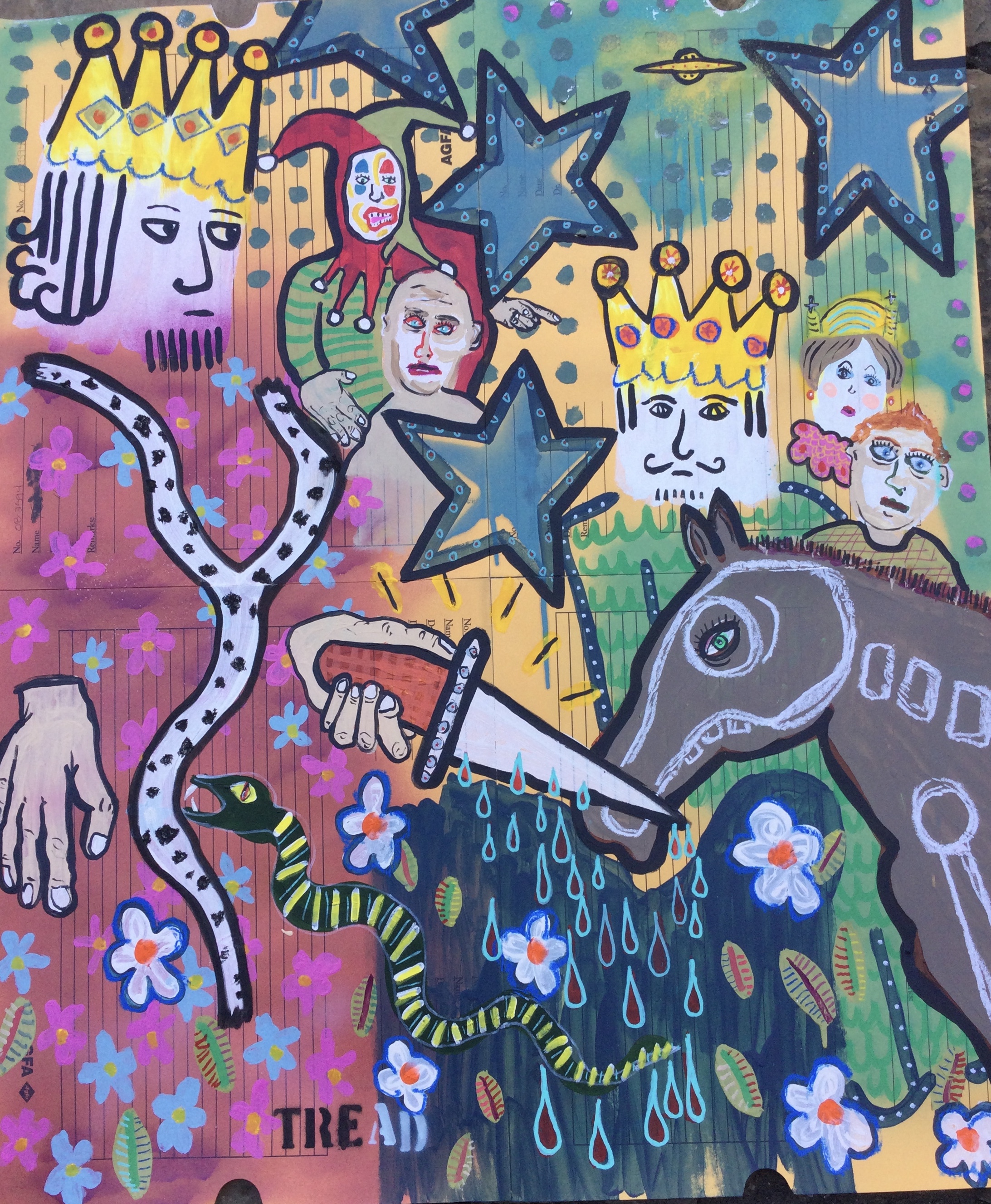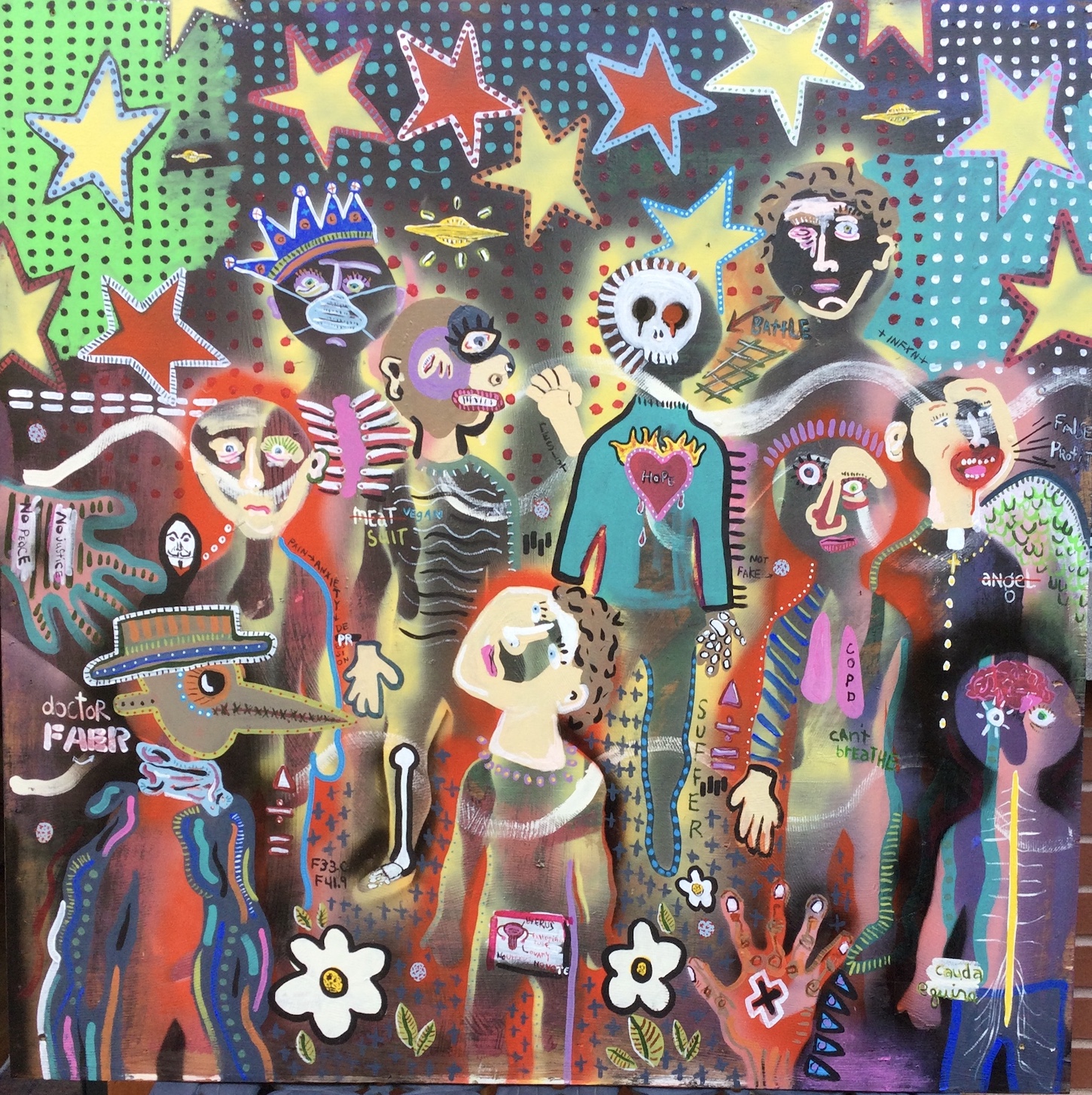 Andy draws his inspiration for his paintings from his diverse career path including pop punk drummer, chimney sweep, forensic autopsy technician and now a practicing chiropractor. His paintings, rendered in the true outsider art/folk art method of using materials at hand, including cardboard, found wood panels and x-ray files, express his visual contemplation of our external influences; social, political and environmental impacts on our mental, spiritual and physical health. All prices below do not include shipping.