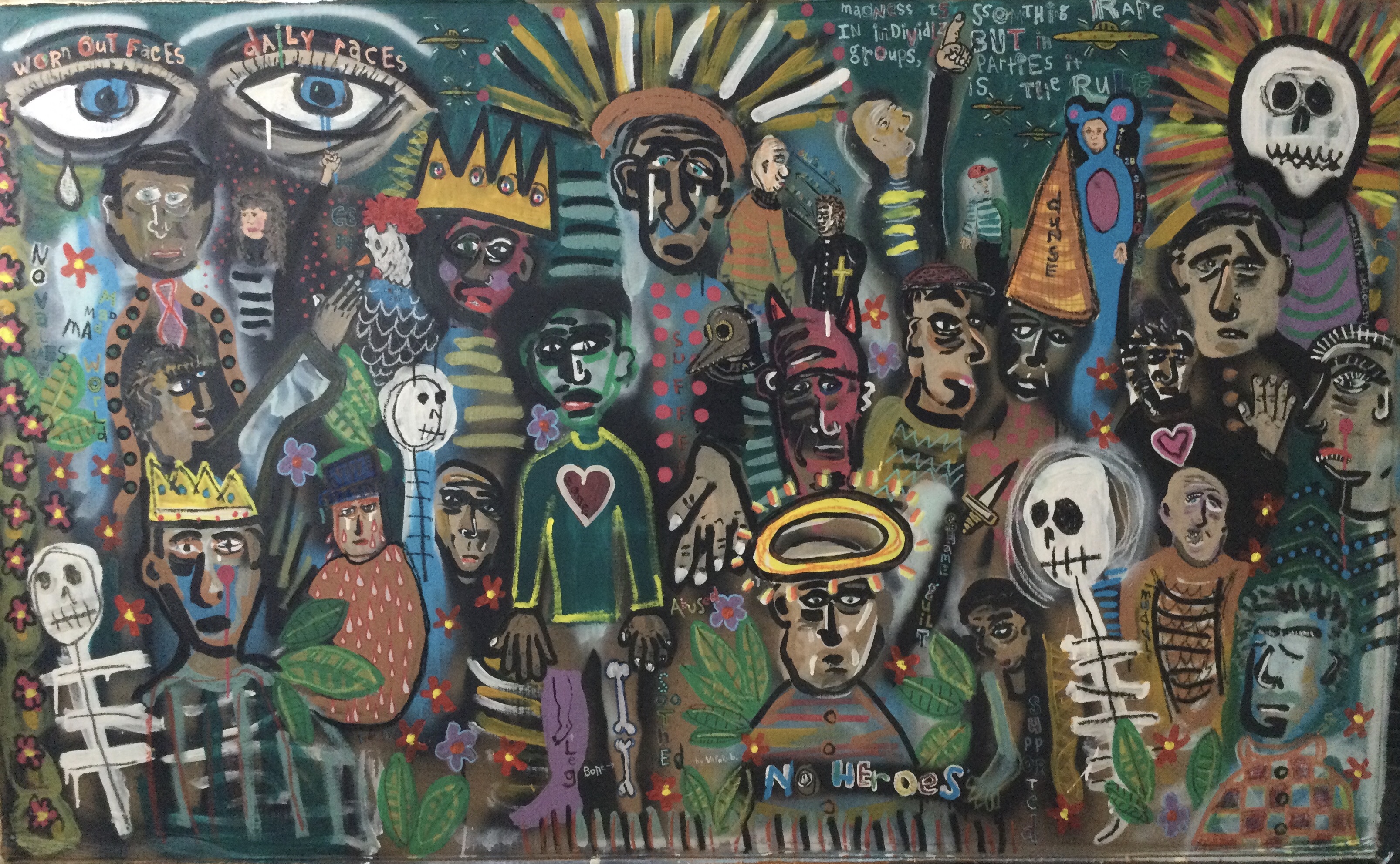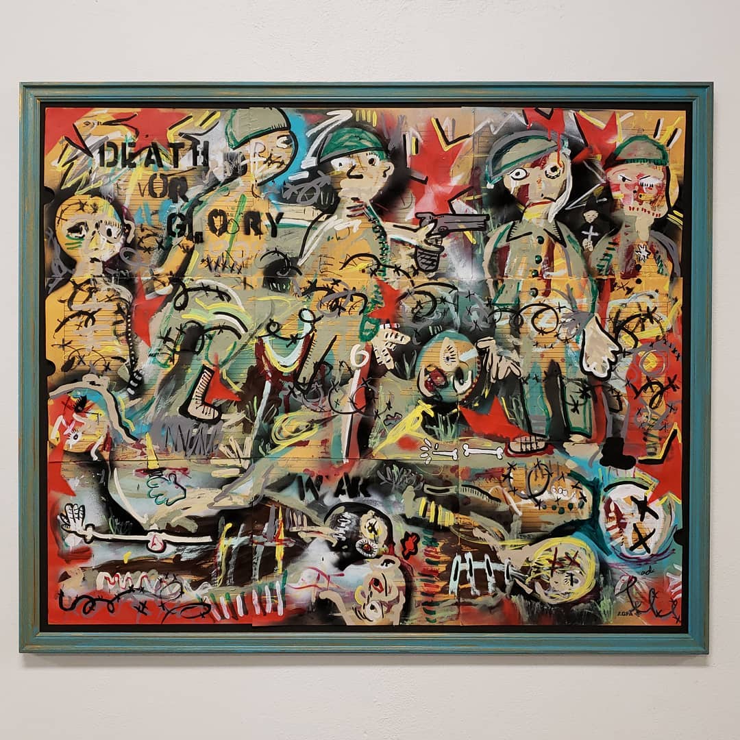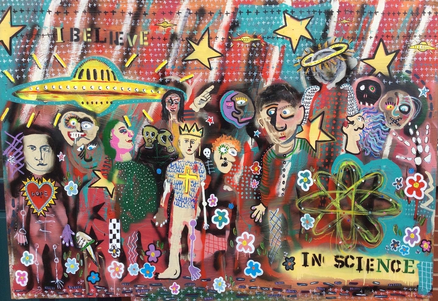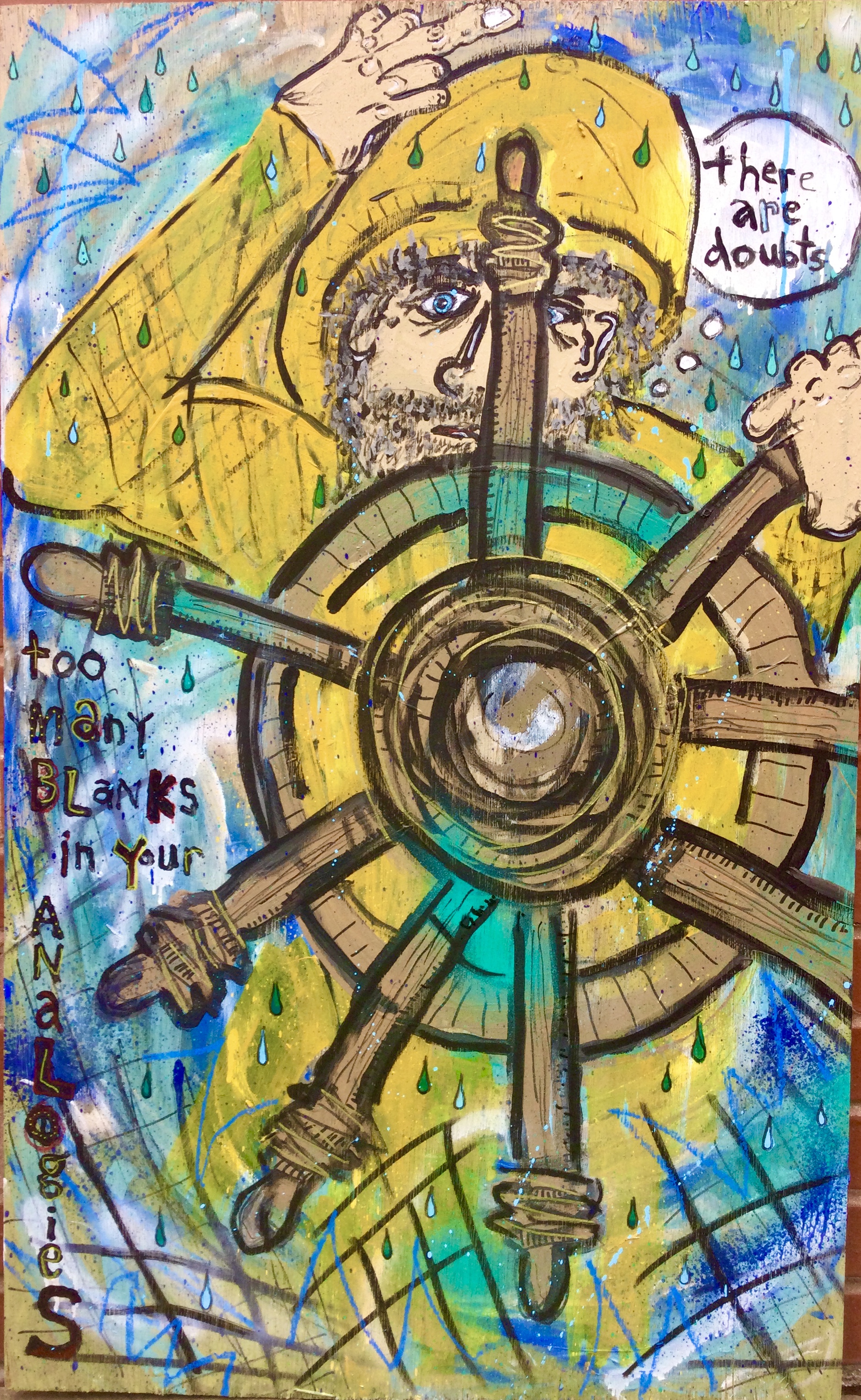 Andy draws his inspiration for his paintings from his diverse career path including pop punk drummer, chimney sweep, forensic autopsy technician and now a practicing chiropractor. His paintings, rendered in the true outsider art/folk art method of using materials at hand, including cardboard, found wood panels and x-ray files, express his visual contemplation of our external influences; social, political and environmental impacts on our mental, spiritual and physical health. All prices below do not include shipping.