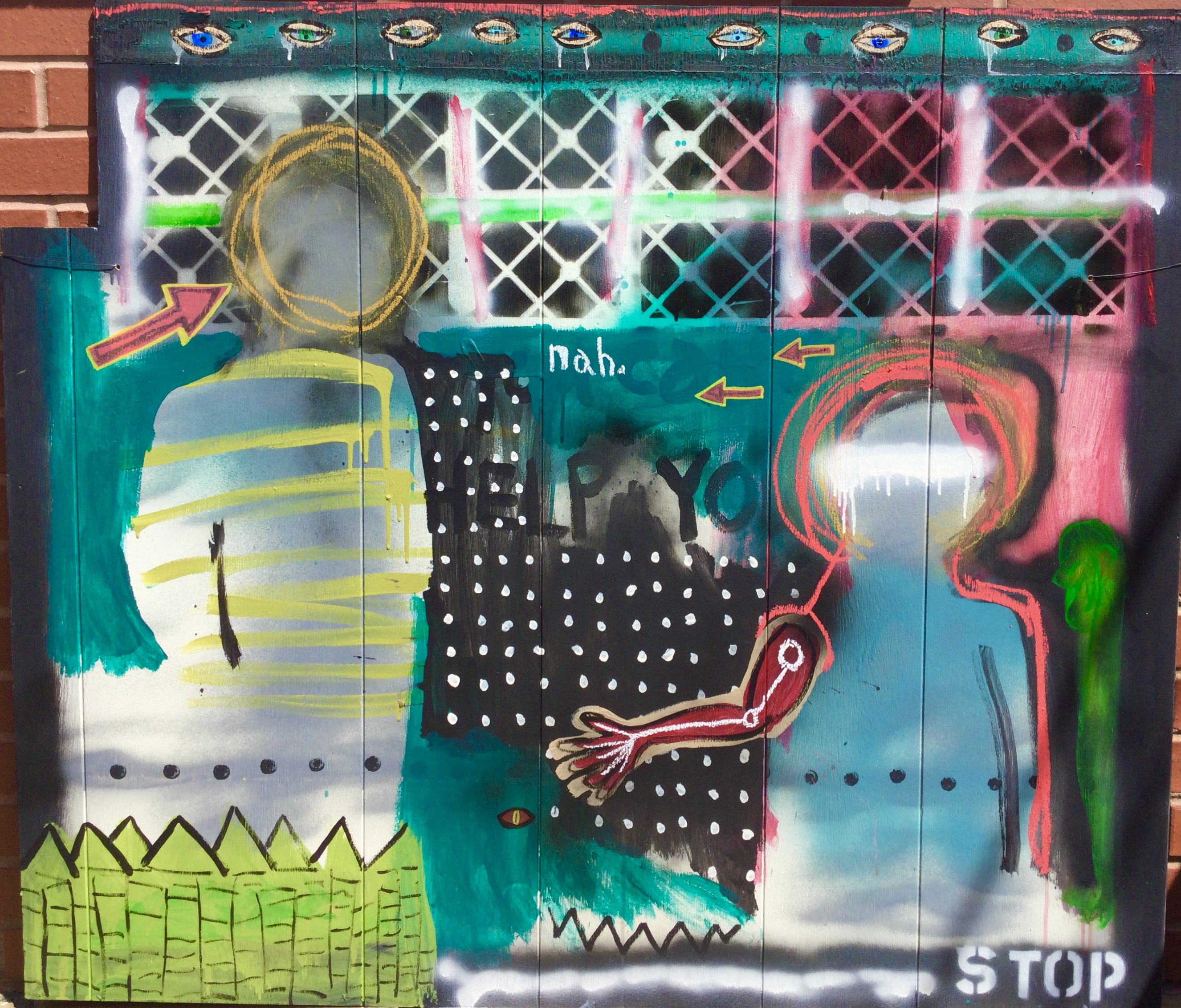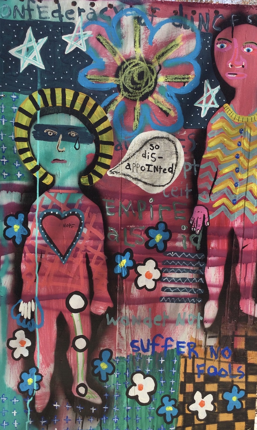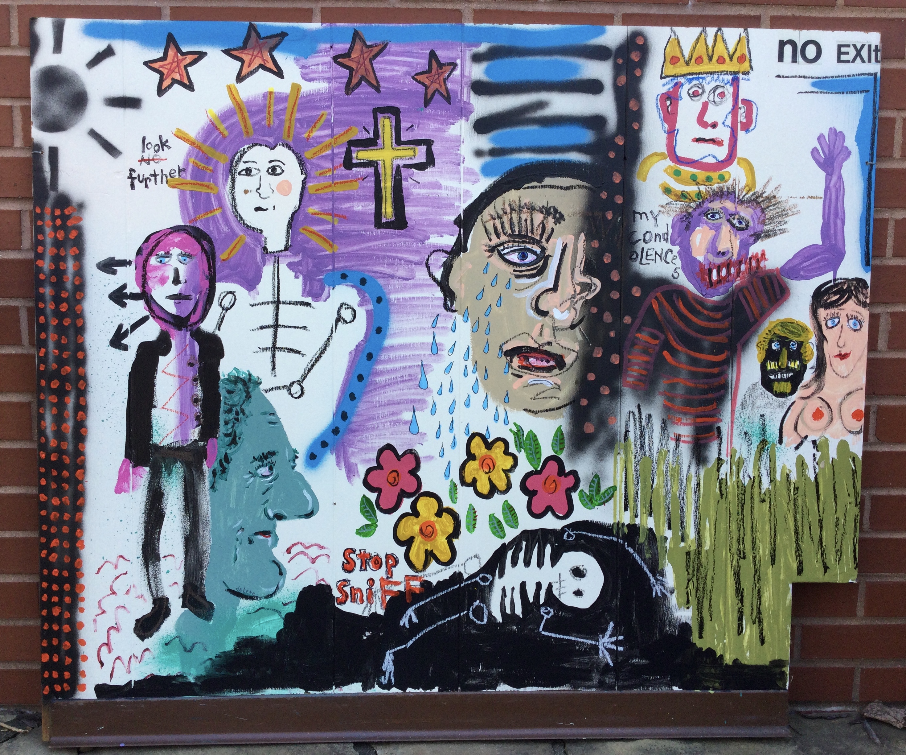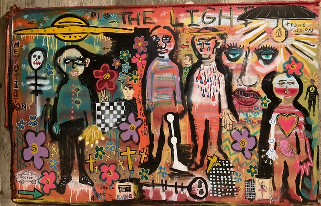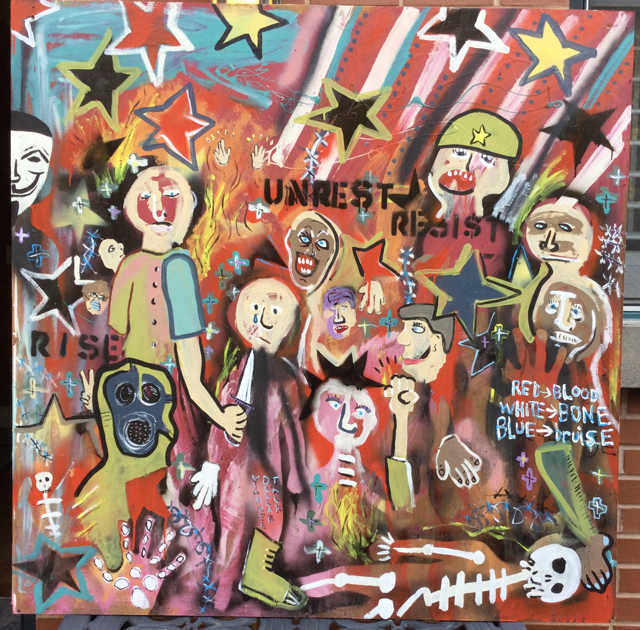 Andy draws his inspiration for his paintings from his diverse career path including pop punk drummer, chimney sweep, forensic autopsy technician and now a practicing chiropractor. His paintings, rendered in the true outsider art/folk art method of using materials at hand, including cardboard, found wood panels and x-ray files, express his visual contemplation of our external influences; social, political and environmental impacts on our mental, spiritual and physical health. All prices below do not include shipping.