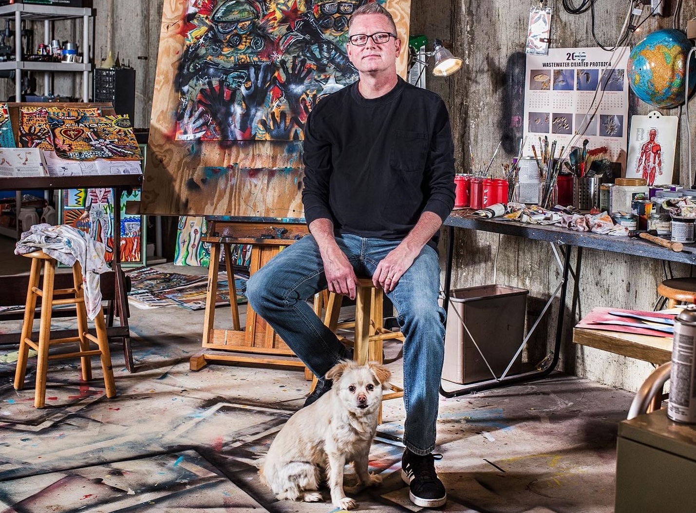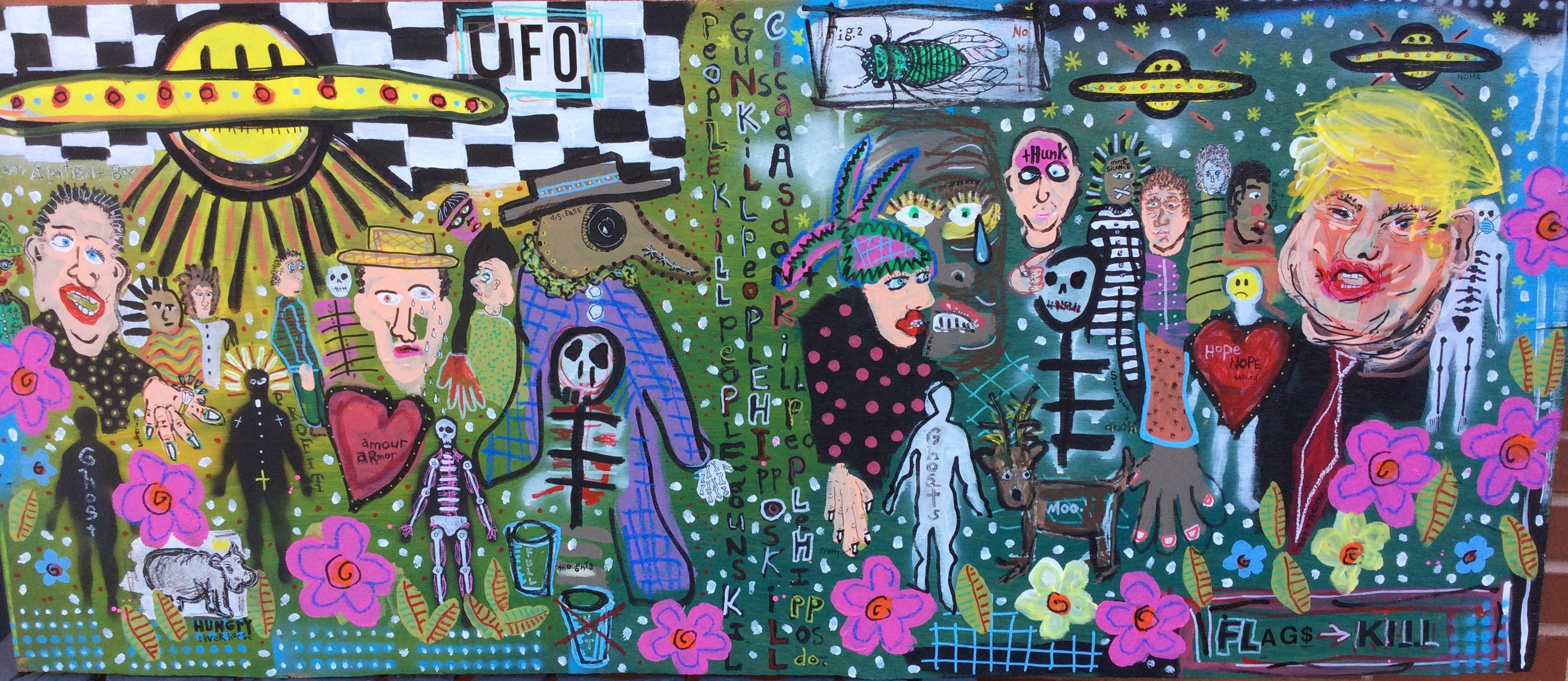 Andy draws his inspiration for his paintings from his diverse career path including pop punk drummer, chimney sweep, forensic autopsy technician and now a practicing chiropractor. His paintings, rendered in the true outsider art/folk art method of using materials at hand, including cardboard, found wood panels and x-ray files, express his visual contemplation of our external influences; social, political and environmental impacts on our mental, spiritual and physical health. All prices below do not include shipping.
